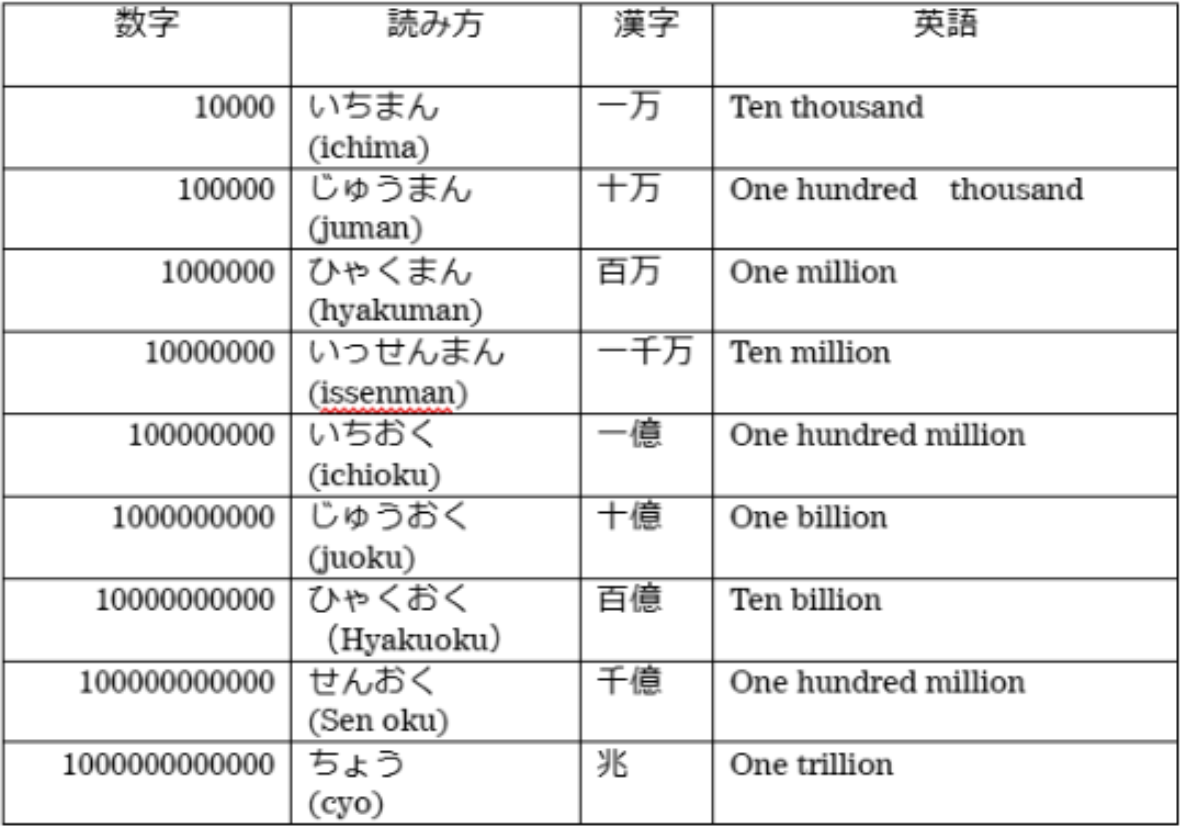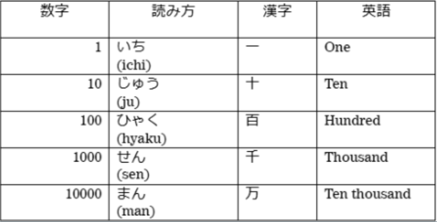 The confusing part here is 10,000. In English, you say “ten thousand” (10 × 1000), but in Japanese, there is a different unit called “man.” Unlike other numbers from 10 to 1000, 10,000 is pronounced as “ichi man” (1 × 10,000).