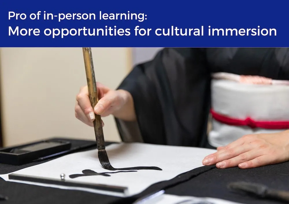 対面で日本語を学ぶことは、文化に浸るユニークな機会を提供します。教室内であれば、先生もより深く日本文化に触れやすく、文化的な文脈の中で日本語を理解することができます。例えば、対面式の授業では、先生が日本食を持ち込んで生徒に試食させることも簡単ですが、オンライン学習ではそうはいきません。さらに、(TCJのような)語学学校では、日本文化を直接体験できるアクティビティやイベント、遠足などを企画することが多い。さらに、ランゲージ・パートナーに直接会ったり、会話交換の機会を持つことで、文化への没入感をさらに高めることができます。