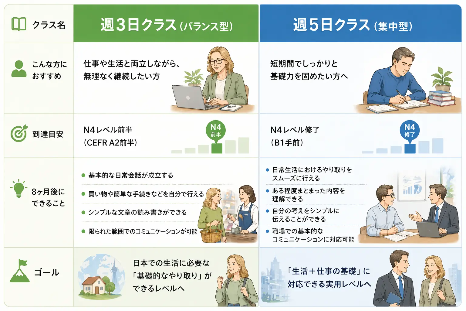日本語は、基礎の積み上げと実践の反復によって初めて定着する言語です。断片的な学習では、会話は続かず、実用的な力にはつながりません。