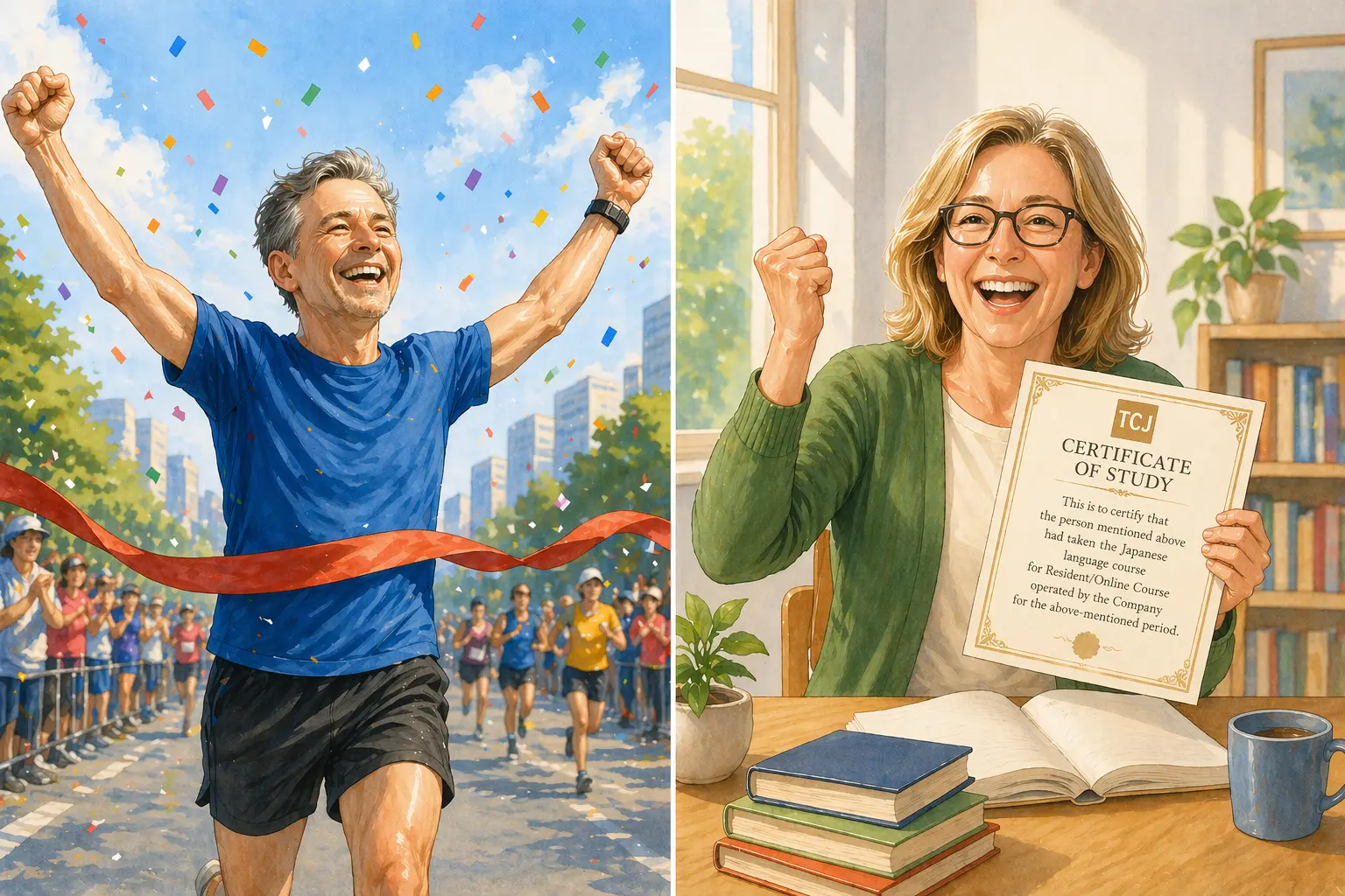 外国語学習を長距離マラソンに例えてみましょう。「ゴールに到達した自分(話せるようになった自分)」をイメージしながら、目の前の小さな目標に向かって一歩ずつ前に進みます。ぐんぐん速く走れる時もあれば、息切れしてしまう時もありますよね。しかし、ゴールを目指して走り続けた後は、想像していた以上の世界や喜び、達成感や自信が待っています。