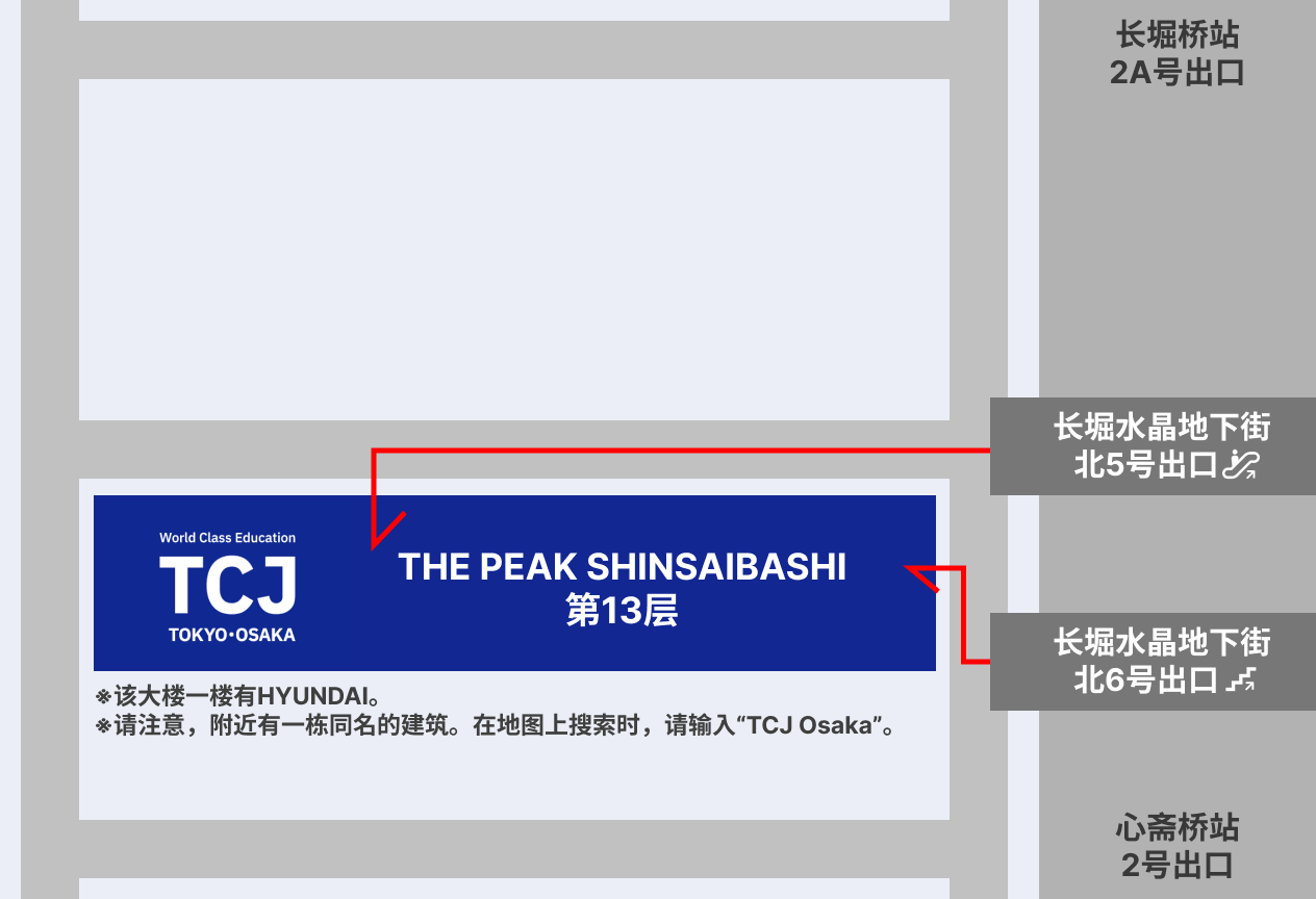 从御堂筋线“心斋桥站”(2号出口)或堺筋线・长堀鹤见绿地线“长堀桥站”(2A出口)出发,请沿地下街“Crysta长堀”向“北6号楼梯出口”方向前进。从北6号楼梯上到地面后,本大楼即在您的正前方。