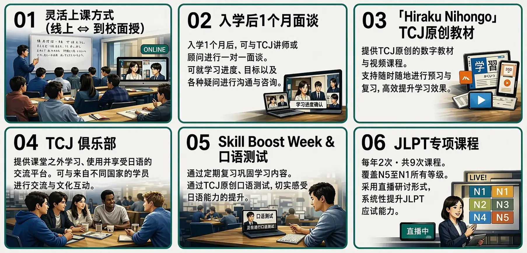 - 提供线下与线上两种上课方式,无论在日本国内还是海外的学习者都可以参与,并在需要时减少通勤时间。